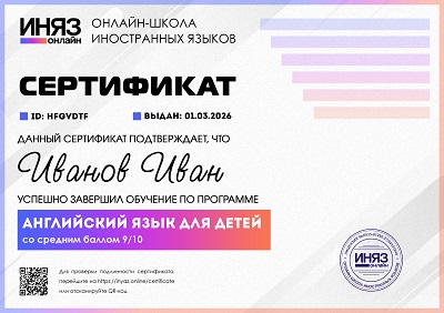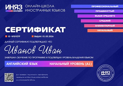 В зависимости от выбранного направления обучения, ученикам онлайн-школы выдаются сертификаты об окончании курсов или сертификат соответствия, подтверждающий определенный уровень владения иностранным языком.